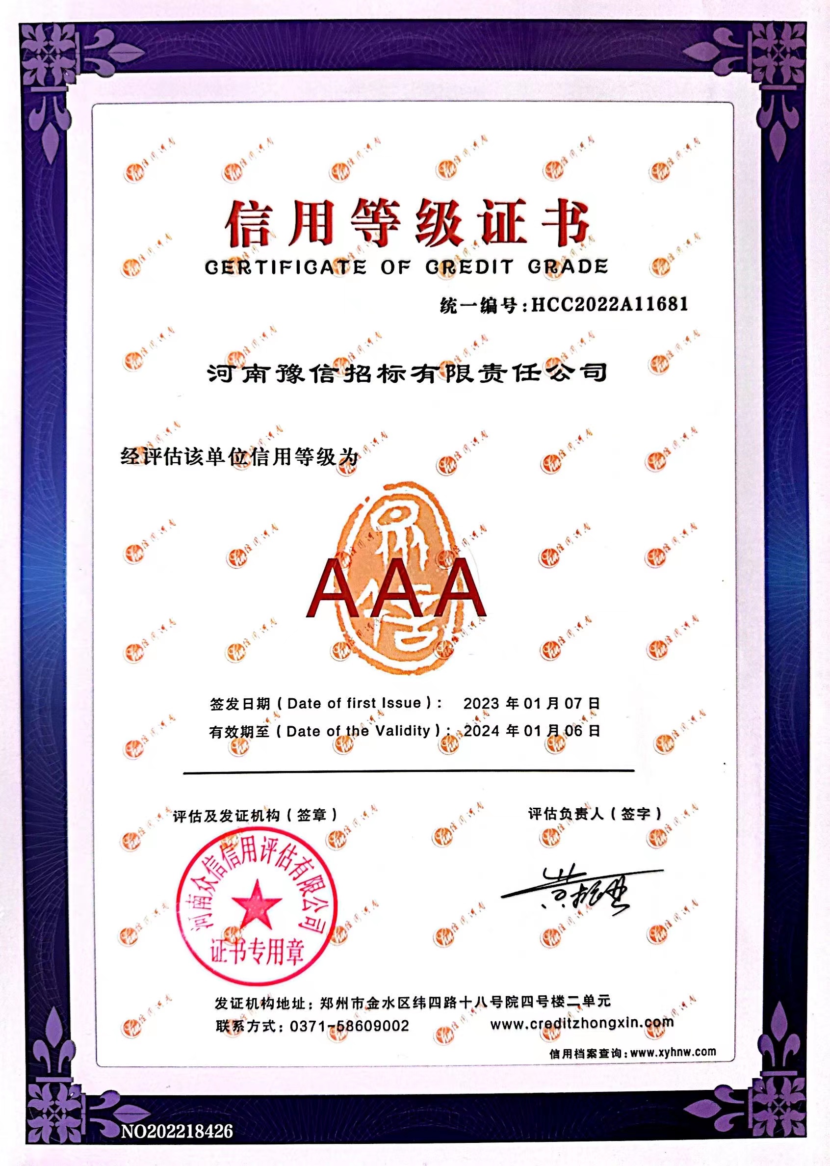 2023年信用等級(jí)AAA證書(shū)