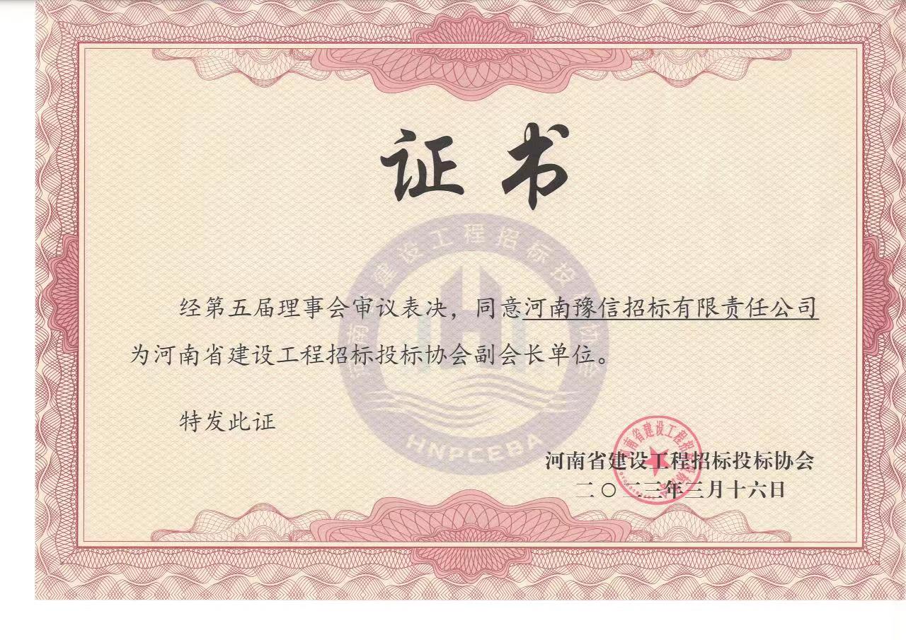 經(jīng)第五屆理事會(huì)審議表決,同意河南豫信招標(biāo)有限責(zé)任公司為河南省建設(shè)工程招標(biāo)投標(biāo)協(xié)會(huì)副會(huì)長(zhǎng)單位。 -