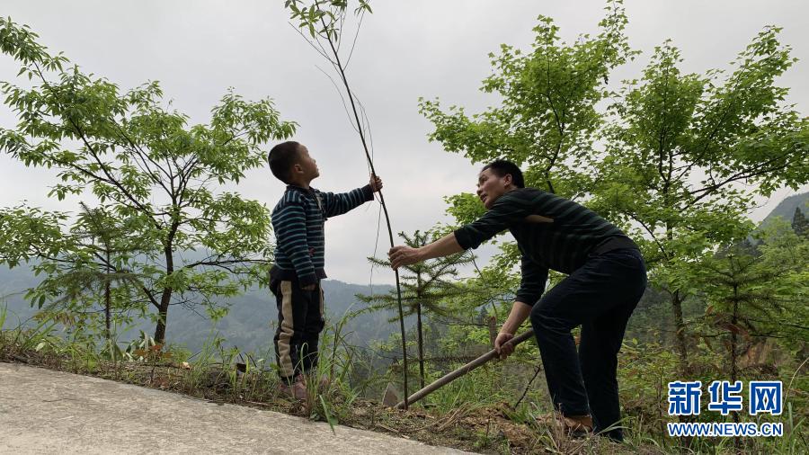 吳新仁(右)帶著兒子吳良友在烏英苗寨的公路邊種植景觀樹(shù)(2019年4月12日攝)。新華社記者 黃孝邦 攝