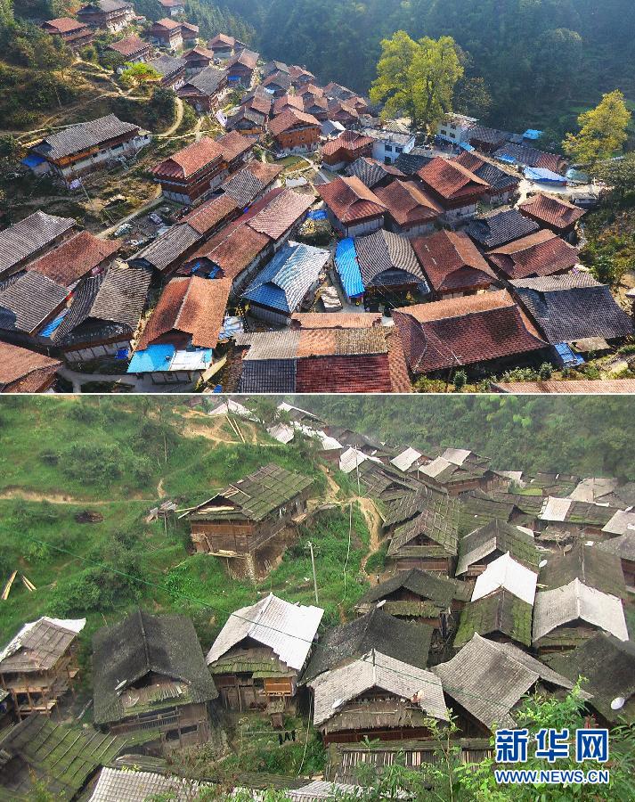 這是一張拼版照片,上圖為:2019年3月20日拍攝的烏英苗寨(無(wú)人機(jī)照片,新華社記者黃孝邦攝);下圖為:2008年9月7日拍攝的烏英苗寨(資料照片)。新華社發(fā)