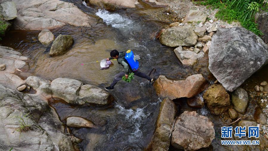烏英苗寨水果種植專(zhuān)業(yè)合作社負(fù)責(zé)人梁秀前過(guò)河去除草(2019年7月25日攝)。新華社記者 黃孝邦 攝