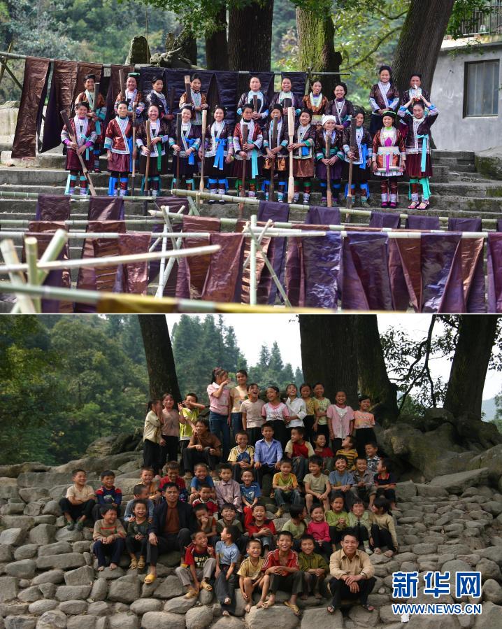這是一張拼版照片,上圖為:2020年10月25日,烏英苗寨“雙語(yǔ)雙向”培訓(xùn)班的同學(xué)們?cè)诠艠?shù)下合影(新華社記者黃孝邦攝);下圖為:2006年9月19日,烏英苗寨教學(xué)點(diǎn)的師生們?cè)诠艠?shù)下合影(龍濤攝)。新華社發(fā)