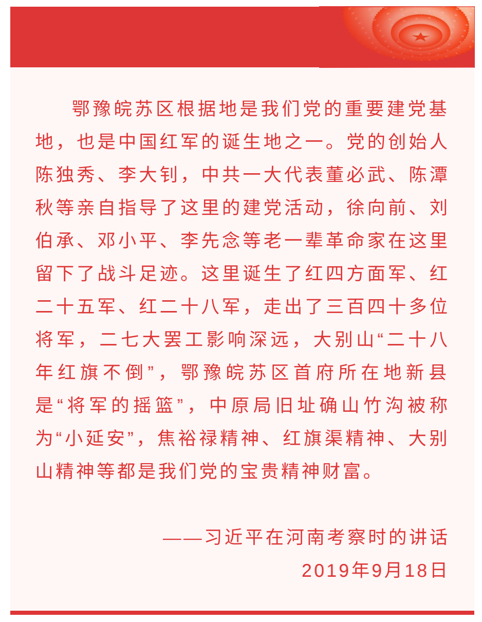 河南新縣是將軍的搖籃。土地革命時(shí)期,這里是黃麻起義的策源地、鄂豫皖革命根據(jù)地首府所在地,先后誕生了紅四方面軍等主力紅軍,走出了多位叱咤風(fēng)云的共和國將軍。