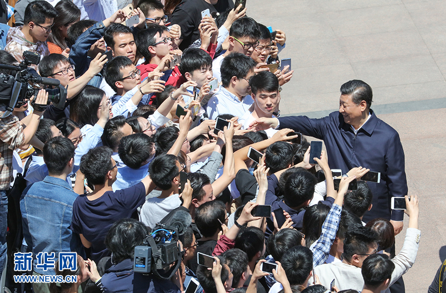 2018年5月2日,中共中央總書記、國家主席、中央軍委主席習(xí)近平來到北京大學(xué)考察。這是習(xí)近平離開學(xué)校時同道路兩旁師生親切握手。新華社記者王曄攝