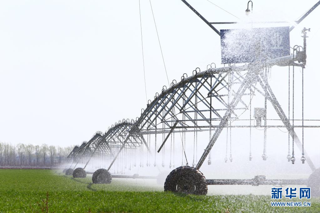 2021 年 2 月 23 日,在河南省鶴壁市??h一片高標準農田里,自走式噴灌機在為小麥澆水。 新華社記者 許雅楠 攝