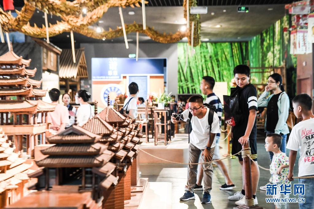 參觀者在廣西民族博物館里參觀風雨橋模型(2019年10月4日攝)。新華社記者 曹祎銘 攝