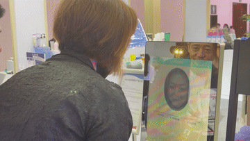 站在“魔鏡”前閉眼,“魔鏡”就會(huì)為測(cè)試者拍照。等待幾秒鐘后,它即可自動(dòng)分析出測(cè)試者皮膚年齡、狀態(tài),并精準(zhǔn)對(duì)接需求,個(gè)性化建議測(cè)試者適用的護(hù)膚品?!澳хR”旁,為緩解大眾脫發(fā)焦慮而設(shè)計(jì)的激光生發(fā)儀、生發(fā)帶十分引人關(guān)注,不時(shí)有參觀者試戴并咨詢采購(gòu)事宜。