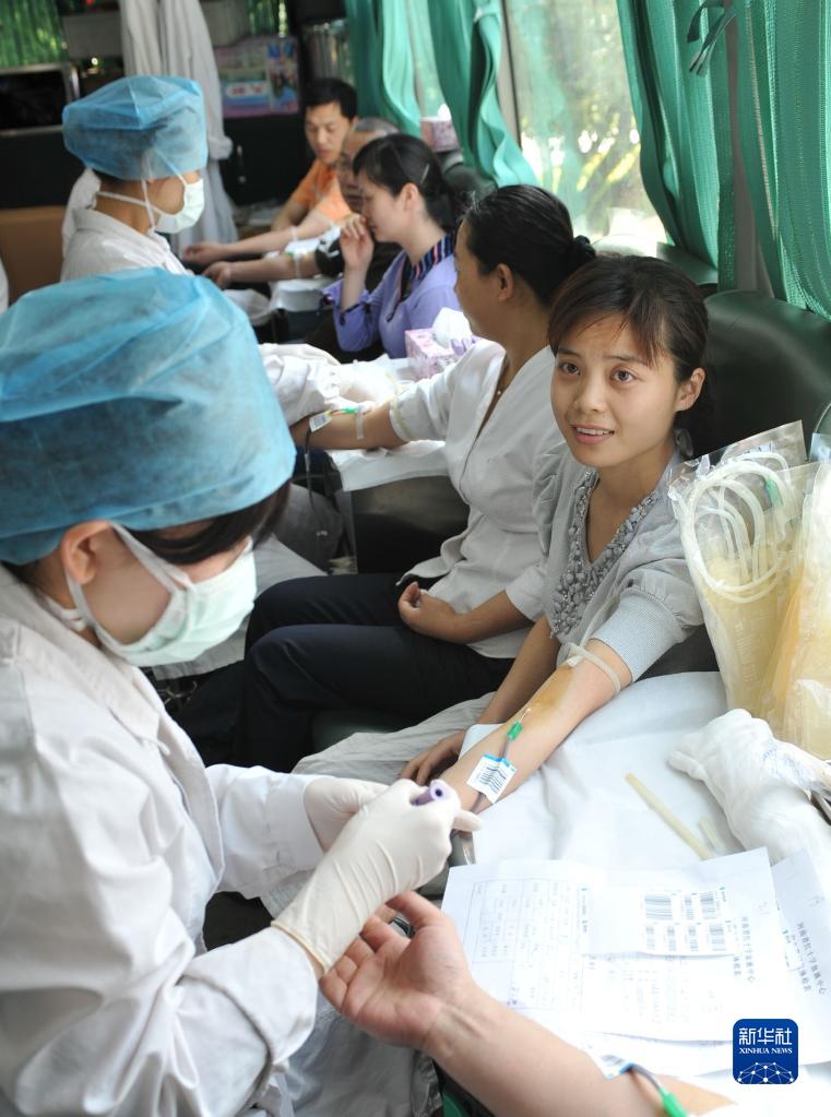 鄭州市委干部肖靜在流動獻(xiàn)血車上獻(xiàn)血(2008年5月14日攝)。2008年5月14日,數(shù)百名鄭州市直機(jī)關(guān)干部職工參加援助活動,并為汶川地震災(zāi)區(qū)的受災(zāi)群眾獻(xiàn)血。新華社記者 趙鵬 攝