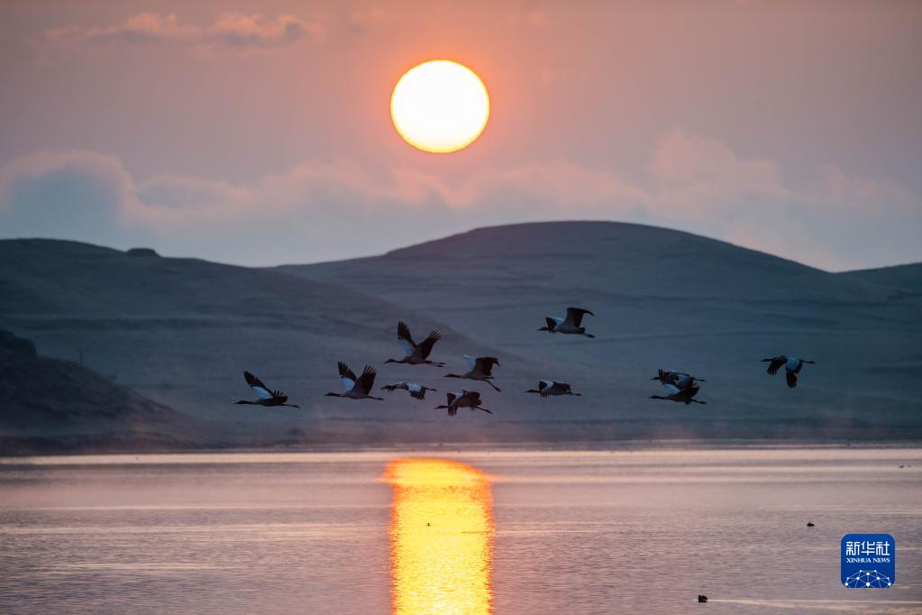 日出時(shí)分,黑頸鶴在云南省昭通市大山包黑頸鶴國(guó)家級(jí)自然保護(hù)區(qū)飛翔(2月25日攝)。新華社記者 胡超 攝