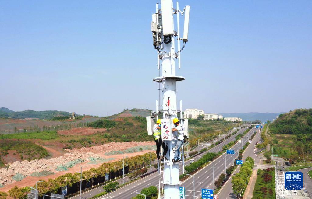 工作人員在位于重慶高新區(qū)高新大道的5G基站建設現(xiàn)場作業(yè)(2020年4月15日攝,無人機照片)。新華社記者 王全超 攝