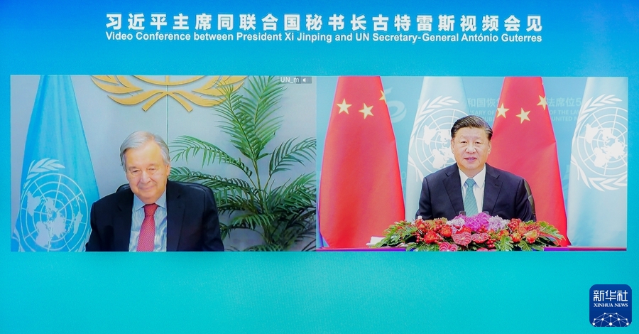 10月25日上午,國(guó)家主席習(xí)近平在北京人民大會(huì)堂以視頻方式會(huì)見(jiàn)聯(lián)合國(guó)秘書長(zhǎng)古特雷斯。新華社記者 翟健嵐 攝