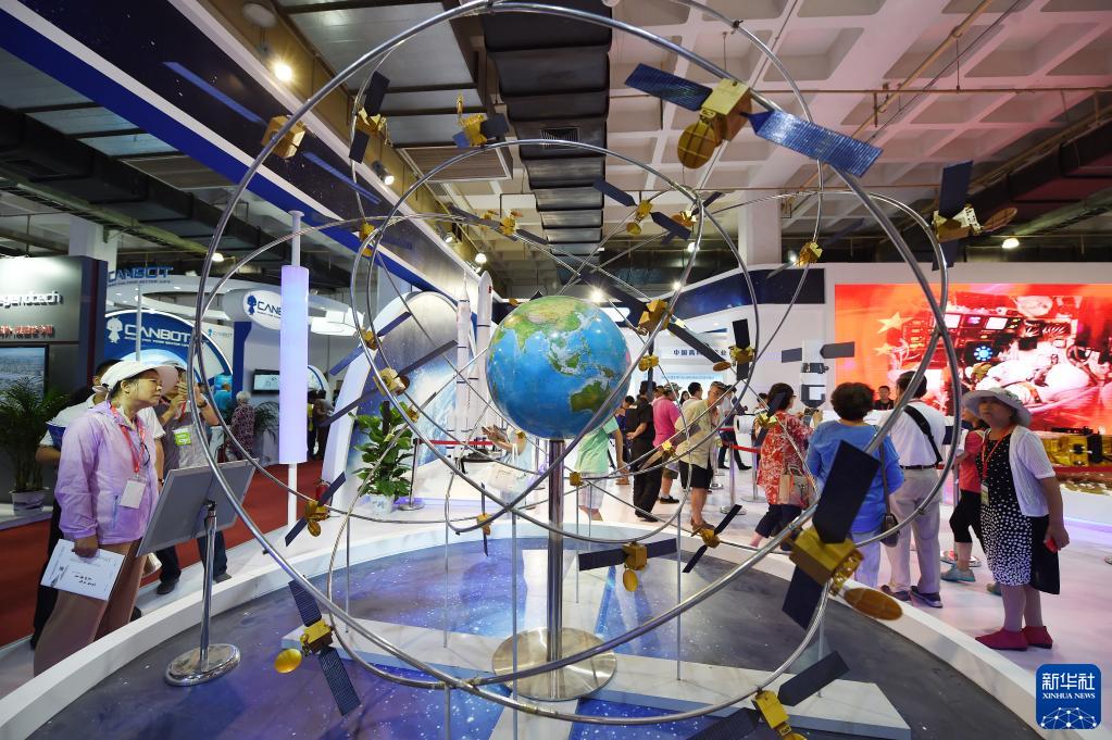 參觀者在第二十屆中國北京國際科技產(chǎn)業(yè)博覽會上參觀展出的北斗衛(wèi)星導(dǎo)航系統(tǒng)模型(2017年6月9日攝)。新華社記者 鞠煥宗 攝