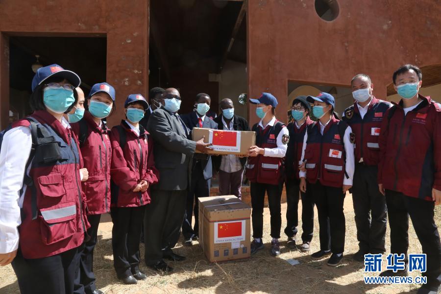 5 月 19 日,在津巴布韋中馬紹納蘭省的姆武爾維醫(yī)院,中國抗疫醫(yī)療專家組為當地醫(yī)療機構捐贈醫(yī)療物資。新華社記者 張玉亮 攝