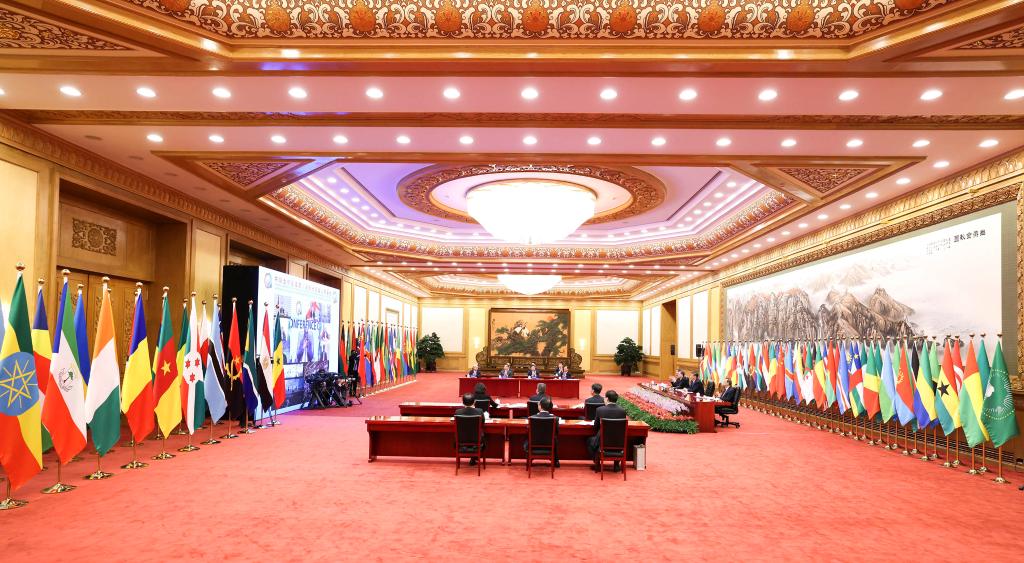 “志合者,不以山海為遠”。29日晚,北京人民大會堂東大廳內,中國和53個非洲國家國旗以及非洲聯盟旗幟并排矗立、恢弘大氣,雖是“云端”相聚,但現場洋溢著濃濃情誼,昭示著中非歷久彌堅的友好關系。