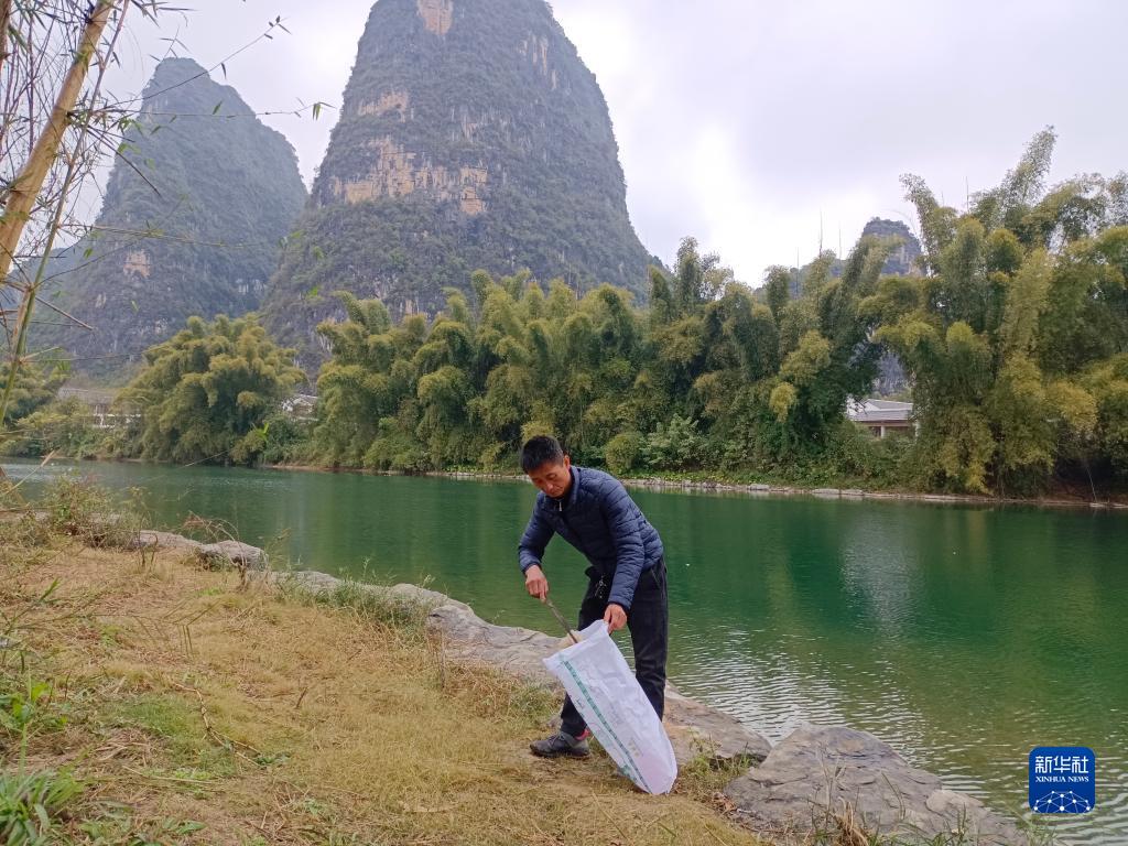 在廣西陽朔縣雞窩渡村,河長徐文通在遇龍河畔撿拾垃圾(12月29日攝)。新華社發(fā)