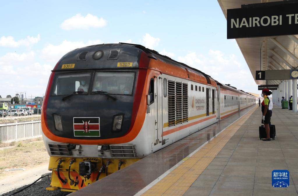 2021年11月17日,由蒙巴薩始發(fā)的蒙內(nèi)鐵路客運(yùn)列車駛?cè)肟夏醽唭?nèi)羅畢站。蒙內(nèi)鐵路連接?xùn)|非第一大港口蒙巴薩和肯首都內(nèi)羅畢,于2017年5月31日開(kāi)通。新華社記者 董江輝 攝