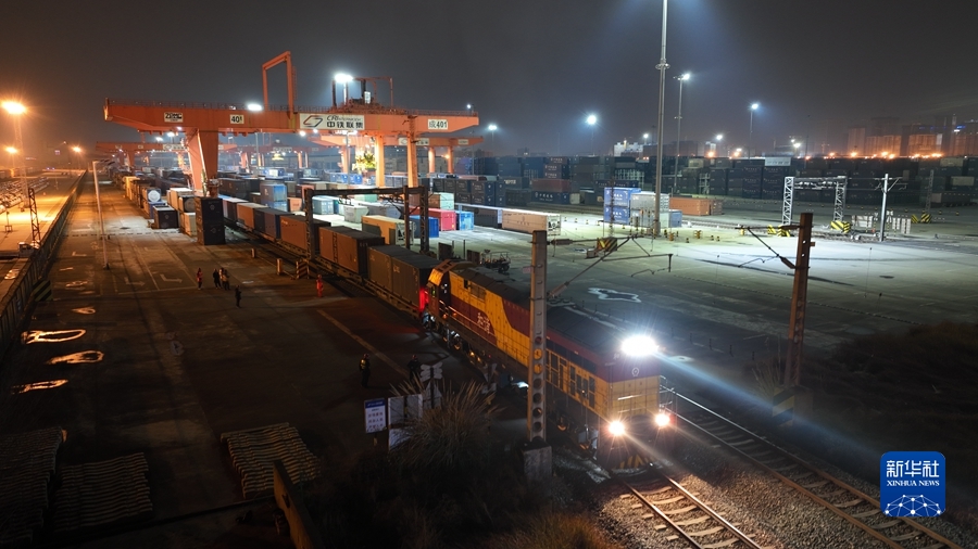 2022年1月28日,中歐班列X8086/5次列車駛出成都鐵路集裝箱中心站,這是中歐班列累計開行的第5萬列列車(無人機(jī)照片)。新華社發(fā)(白桂斌 攝)