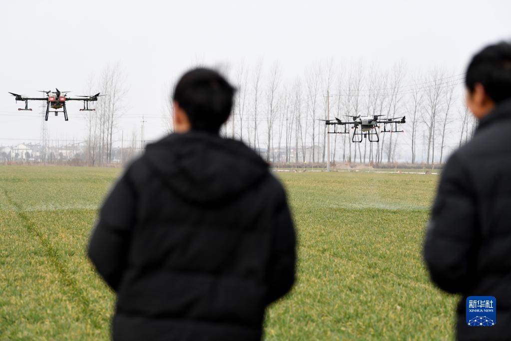 2月11日,無人機在安徽省亳州市趙橋鄉(xiāng)“無人農(nóng)場”噴灑除草劑。新華社記者 劉軍喜 攝