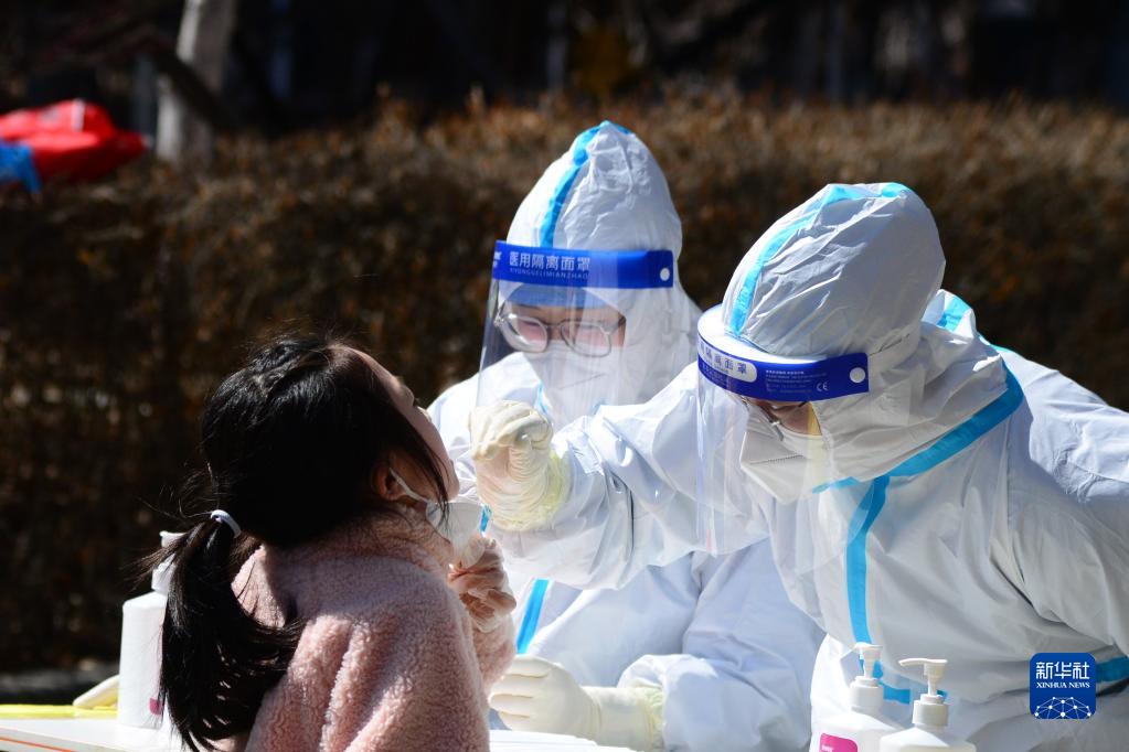 4月7日,在長春市南關(guān)區(qū)一處核酸檢測點,醫(yī)務(wù)人員為居民進行核酸采樣。新華社記者 張建 攝