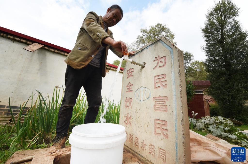 甘肅省定西市渭源縣元古堆村村民在自來水龍頭前接水(2019年9月3日攝)。新華社記者 范培珅 攝