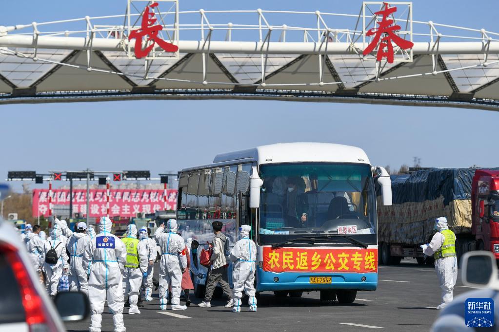 在吉林長春高速公路東出口,返鄉(xiāng)農(nóng)民登上返鄉(xiāng)公交專線(4月12日攝)。新華社發(fā)