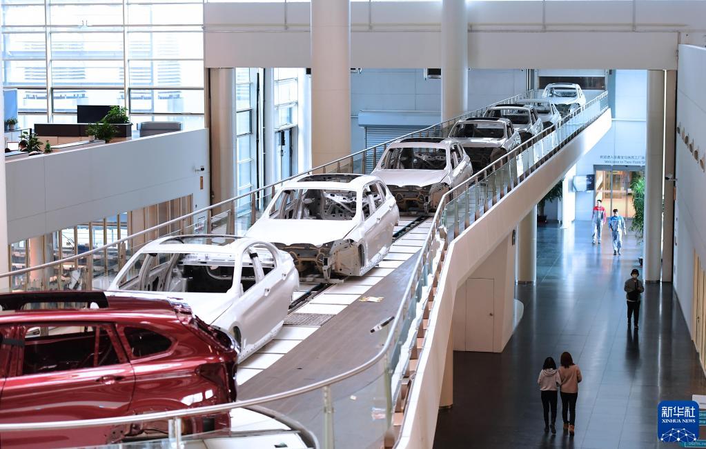 2月16日,在華晨寶馬沈陽鐵西工廠,生產(chǎn)中的車輛穿過辦公區(qū)。新華社記者 楊青 攝