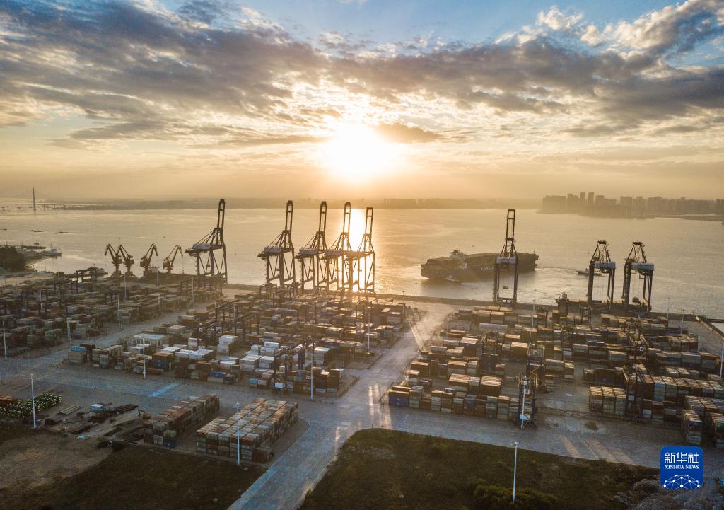 這是2021年12月5日清晨在海南洋浦經(jīng)濟(jì)開(kāi)發(fā)區(qū)拍攝的海南自貿(mào)港建設(shè)重要的集裝箱航運(yùn)樞紐——洋浦國(guó)際集裝箱碼頭(無(wú)人機(jī)照片)。新華社記者 蒲曉旭 攝