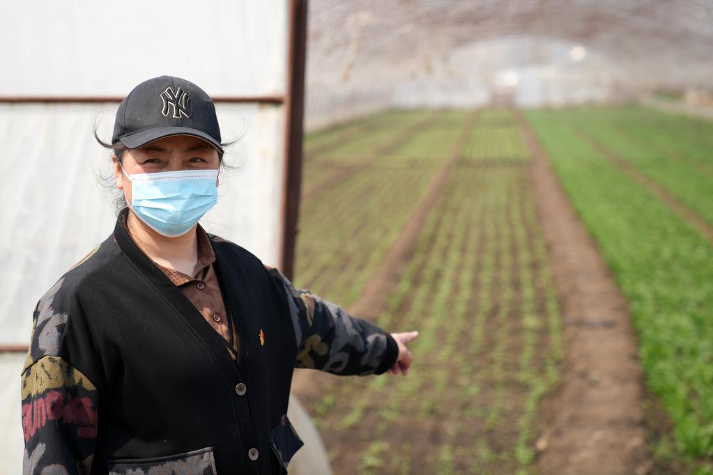 4月19日,在哈爾濱市道外區(qū)民主鎮(zhèn)光明村,村黨支部書(shū)記唐艷麗在介紹種植情況。新華社記者王建威 攝