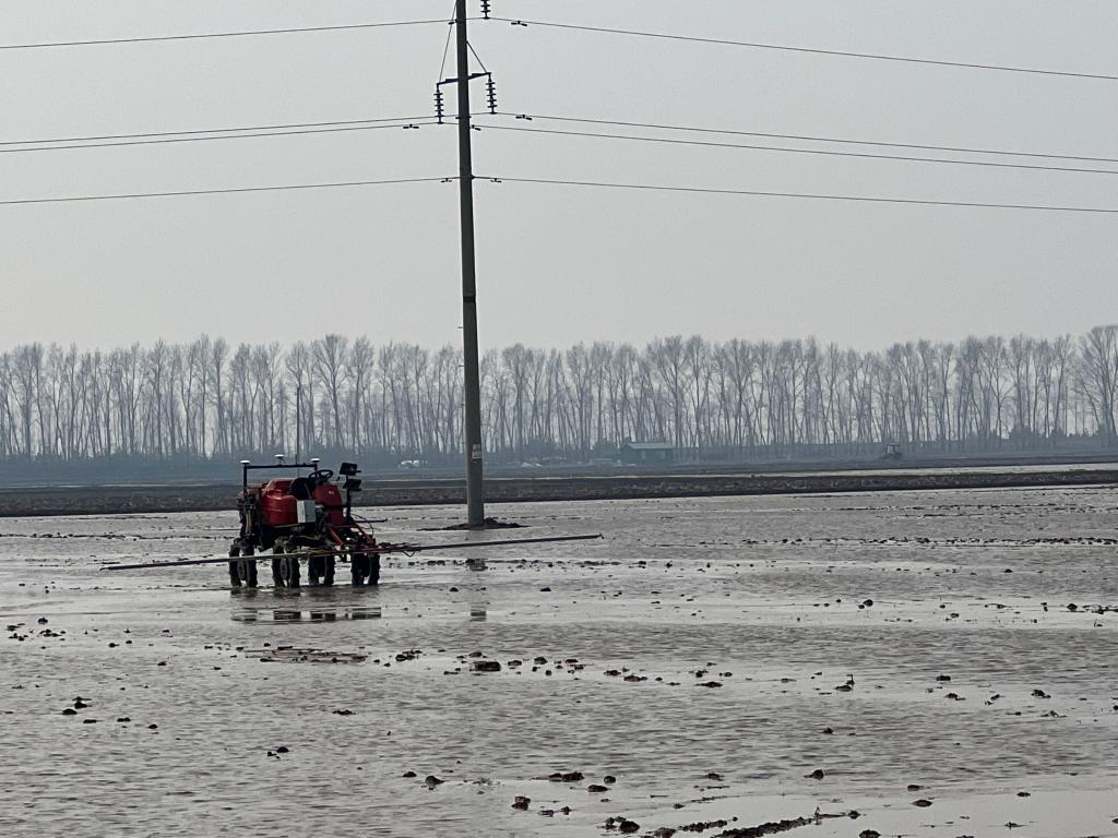 北大荒集團(tuán)建三江分公司創(chuàng)業(yè)農(nóng)場(chǎng)有限公司的一塊水田里,無(wú)人駕駛智能攪漿整地機(jī)正在作業(yè)。(受訪者供圖)