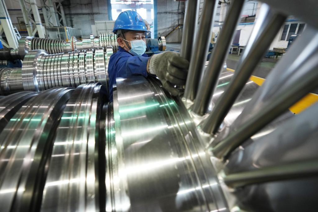 4月15日,在哈電集團(tuán)哈爾濱汽輪機(jī)廠有限責(zé)任公司車(chē)間,工人在進(jìn)行生產(chǎn)作業(yè)。新華社記者王建威 攝
