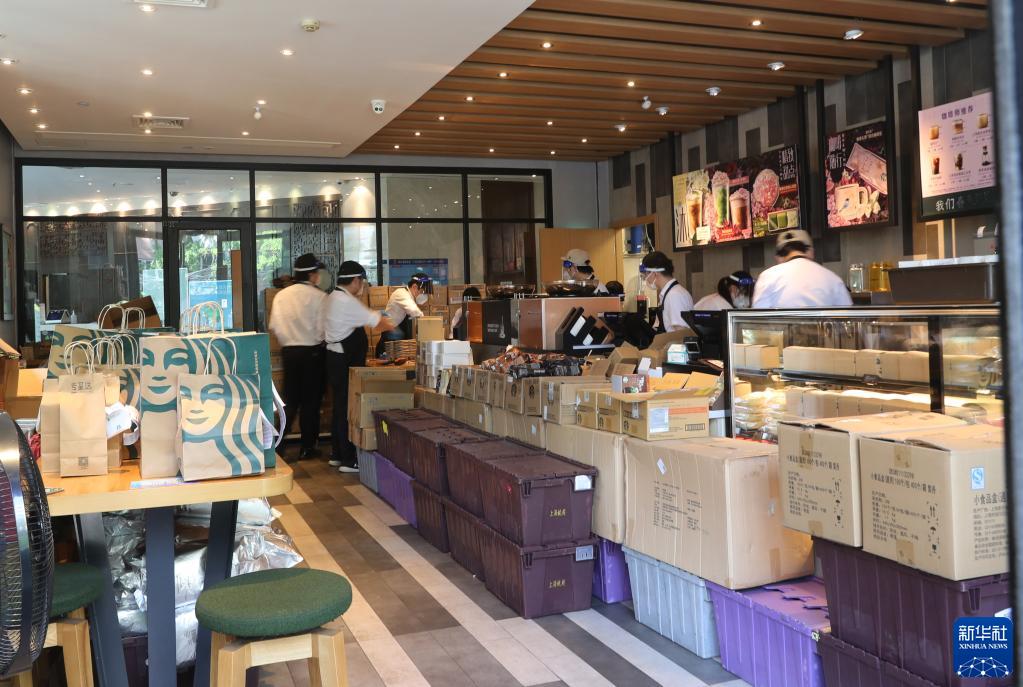 5月17日,工作人員在位于上海市徐匯區(qū)的一家星巴克咖啡店內(nèi)制作網(wǎng)絡訂單貨品。新華社記者 方喆 攝