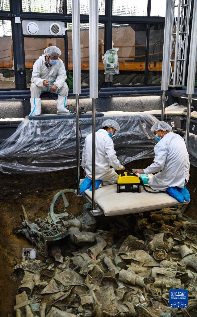 這是在三星堆遺址8號“祭祀坑”拍攝的銅神獸(6月1日攝)。新華社記者 王曦 攝