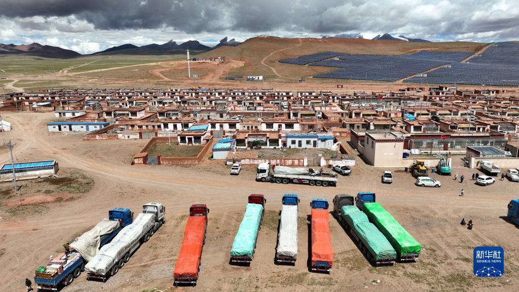 在西藏那曲市雙湖縣多瑪鄉(xiāng)仲魯瑪村,運(yùn)輸家具的貨車整裝待發(fā)(2022年7月13日攝,無(wú)人機(jī)照片)。新華社記者 晉美多吉 攝