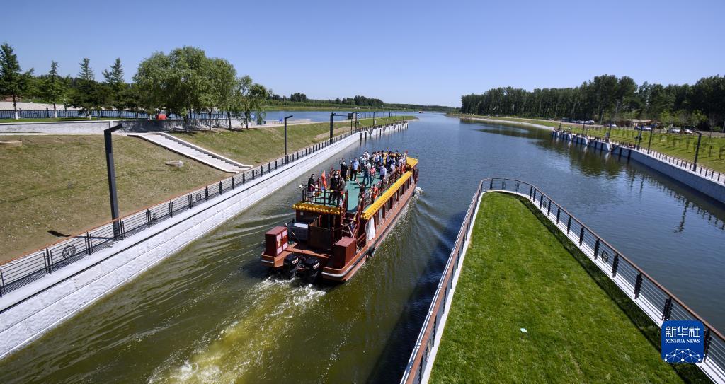 2022年6月24日,京杭大運(yùn)河京冀段全線62公里實(shí)現(xiàn)游船通航。這是載著北京游客和建設(shè)者代表的游船通過船閘進(jìn)入京杭大運(yùn)河河北段。新華社記者 李欣 攝