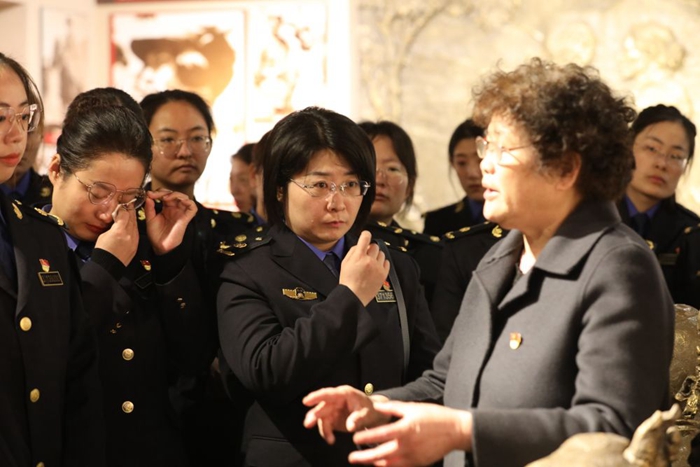 2021年3月5日,山東省臨沂市沂南縣綜合行政執(zhí)法局女黨員聆聽于愛梅(右二)講紅嫂擁軍支前故事,很多黨員被感動(dòng)流淚。杜昱葆 攝