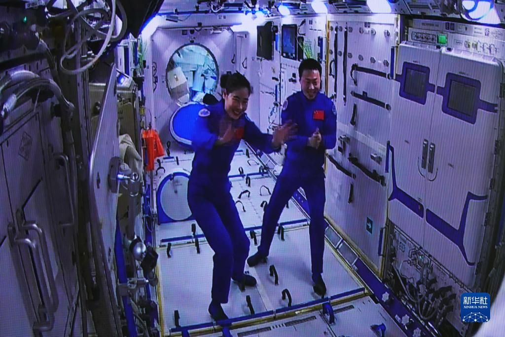 11月30日在酒泉衛(wèi)星發(fā)射中心拍攝的神舟十四號(hào)航天員劉洋、蔡旭哲在問(wèn)天實(shí)驗(yàn)艙迎接神舟十五號(hào)航天員乘組的畫(huà)面。新華社記者 郭中正 攝