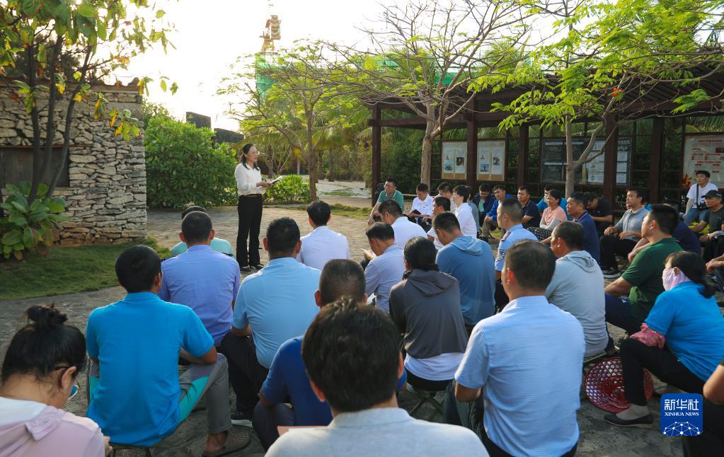 11月17日,黨的二十大代表、海南陵水黎族自治縣文羅鎮(zhèn)副鎮(zhèn)長(zhǎng)、五星村黨總支書記黃麗萍在三沙市趙述島宣講黨的二十大精神。新華社發(fā)(吳亞鐵攝)