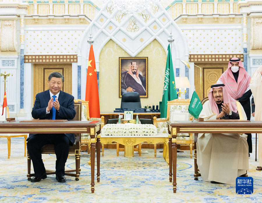 當(dāng)?shù)貢r(shí)間12月8日下午,國(guó)家主席習(xí)近平在利雅得王宮會(huì)見(jiàn)沙特國(guó)王薩勒曼。這是兩國(guó)元首親自簽署《中華人民共和國(guó)和沙特阿拉伯王國(guó)全面戰(zhàn)略伙伴關(guān)系協(xié)議》,同意每?jī)赡暝趦蓢?guó)輪流舉行一次元首會(huì)晤。新華社記者 黃敬文 攝