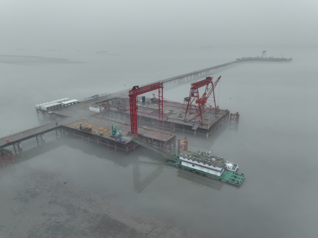 連接江蘇蘇州、泰州和南通的張靖皋長江大橋南航道橋施工現(xiàn)場(1月13日攝)。新華社記者季春鵬 攝
