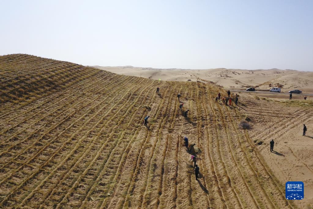 在甘肅省武威市古浪縣北部沙區(qū)旱麻崗治沙點,八步沙林場治沙人和群眾一起扎草方格壓沙(2020年3月6日攝,無人機照片)。新華社記者 范培珅 攝