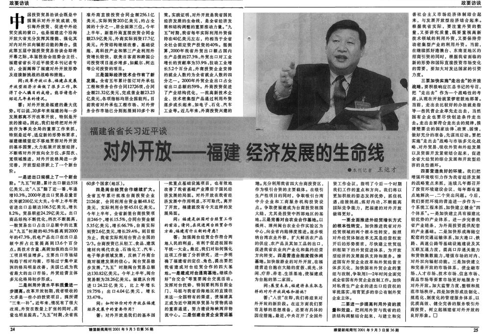 緊接著,我根據(jù)與編輯部商量的意見,向習(xí)近平同志提供了一份采訪提綱,沒幾天,就收到了他接受書面采訪的材料。他在文章中介紹了福建改革開放以來外向型經(jīng)濟(jì)發(fā)展情況,并明確表示,對(duì)外開放是福建國(guó)民經(jīng)濟(jì)發(fā)展的生命線,是全省經(jīng)濟(jì)發(fā)展和結(jié)構(gòu)調(diào)整的重要推動(dòng)力量。