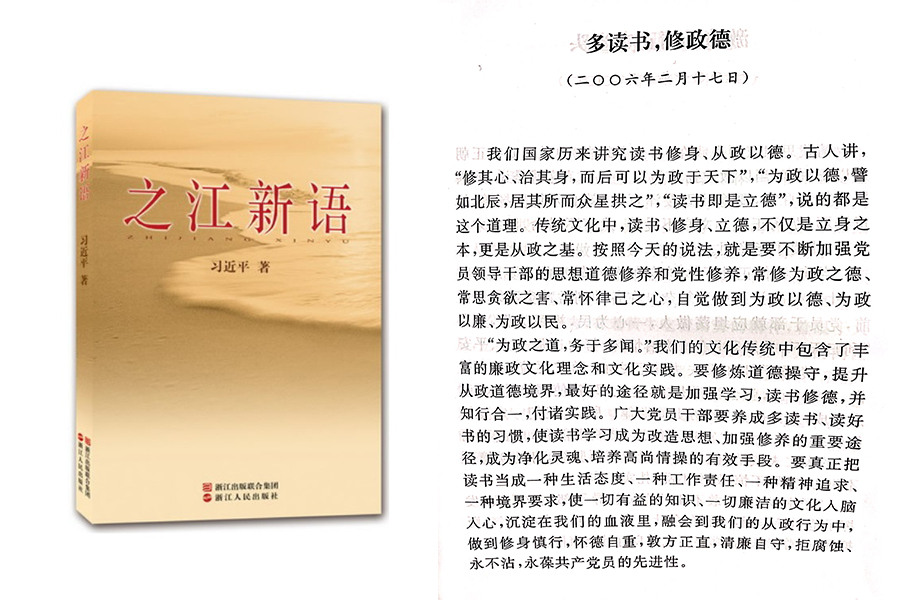 2006年2月17日,時(shí)任浙江省委書(shū)記的習(xí)近平用筆名“哲欣”在《浙江日?qǐng)?bào)》“之江新語(yǔ)”專(zhuān)欄發(fā)表題為《多讀書(shū),修政德》的文章。他說(shuō),我們國(guó)家歷來(lái)講究讀書(shū)修身、從政以德。廣大黨員干部要養(yǎng)成多讀書(shū)、讀好書(shū)的習(xí)慣,使讀書(shū)學(xué)習(xí)成為改造思想、加強(qiáng)修養(yǎng)的重要途徑,成為凈化靈魂、培養(yǎng)高尚情操的有效手段。