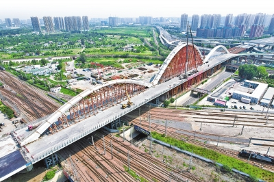 (圖/本報(bào)記者 王錚 攝) ??7月18日,隨著合龍指令的發(fā)出,鄭州新建彩虹橋主橋中跨最后一節(jié)鋼箱拱緩緩放落,橋梁的“彩虹”輪廓初現(xiàn)芳容。 ??“這節(jié)鋼箱拱長(zhǎng)8.4米、寬8米、高2米。”承建方中鐵大橋局彩虹橋項(xiàng)目相關(guān)負(fù)責(zé)人表示,至此,新建彩虹橋的鋼箱拱全部安裝完畢,標(biāo)志著大橋主體結(jié)構(gòu)即將完工,為實(shí)現(xiàn)按期通車目標(biāo)奠定了堅(jiān)實(shí)基礎(chǔ)。 ??被稱為“彩虹橋”的鄭州北環(huán)快速路鐵路跨線大橋,是鄭州北區(qū)東西向的咽喉要道,1994年年底建成通車,由于近年來交通量逐年增大,橋梁通行壓力較大,該橋經(jīng)過多次整修仍無法滿足市民出行需求,2019年拆除重建。 ??據(jù)介紹,鄭州新建彩虹橋上部結(jié)構(gòu)為下承式三跨連續(xù)單拱肋鋼箱系桿拱橋,重2000多噸。預(yù)計(jì)新橋建成后,將大大緩解北三環(huán)東西向的交通壓力,對(duì)于完善鄭州的快速路網(wǎng)結(jié)構(gòu),加強(qiáng)中心城區(qū)與周邊區(qū)域的聯(lián)系等具有重要意義。(記者 李林)