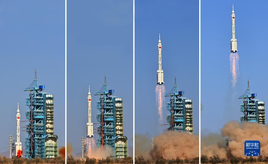 這是神舟十七號載人飛船發(fā)射升空過程(拼版照片,10月26日攝)。新華社記者 李剛 攝