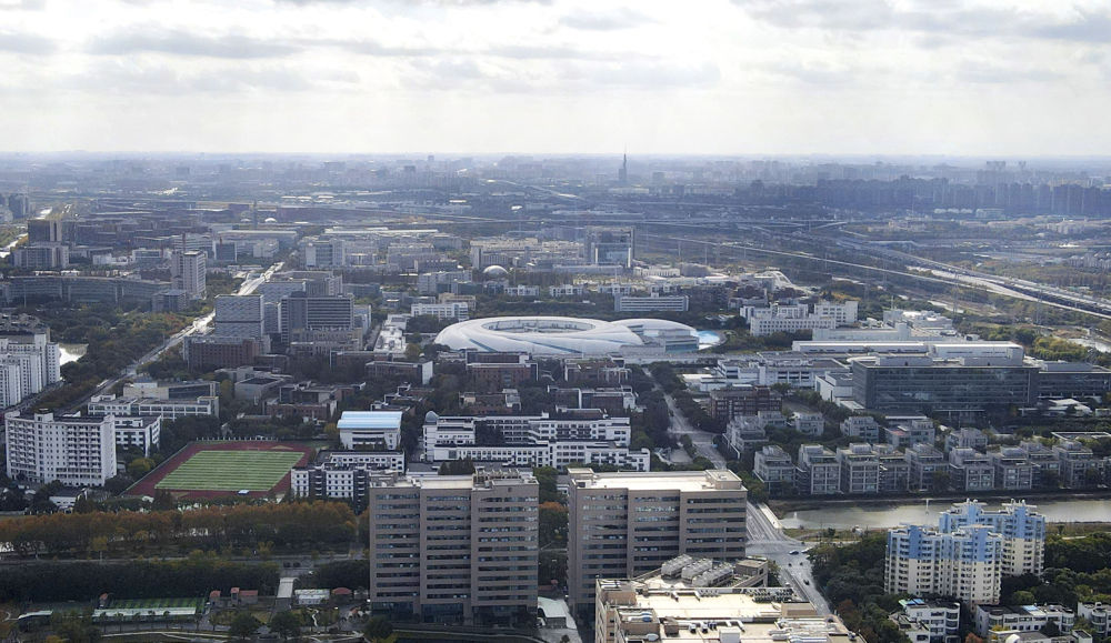 這是2023年11月25日在上海浦東新區(qū)張江科學(xué)城拍攝的形如鸚鵡螺的大科學(xué)裝置上海光源(中)(無人機(jī)照片)。新華社記者 方喆 攝