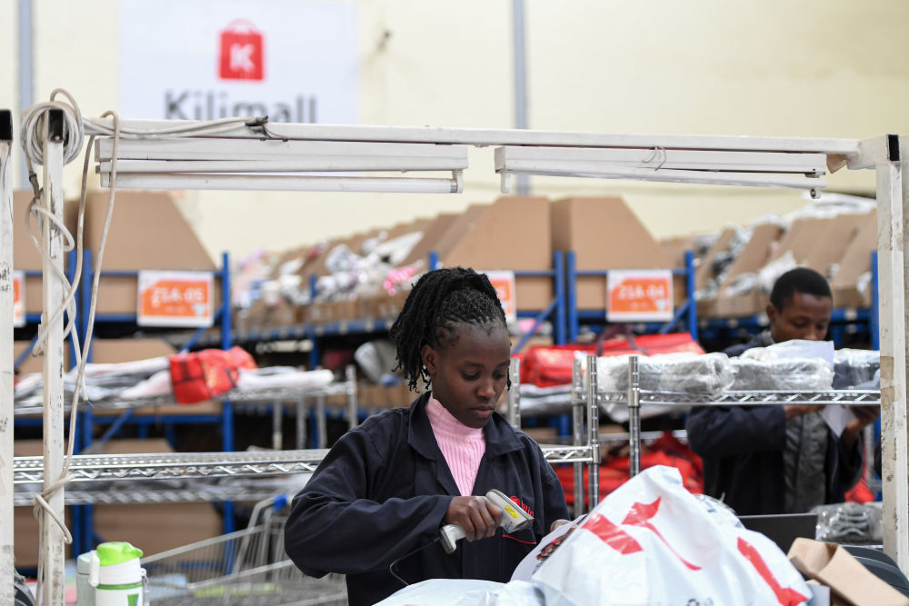 2023年7月28日,在肯尼亞姆洛隆戈,湖南長(zhǎng)沙非拓信息技術(shù)有限公司旗下電商平臺(tái)Kilimall的員工在倉庫內(nèi)分揀貨物。新華社記者 李亞輝 攝