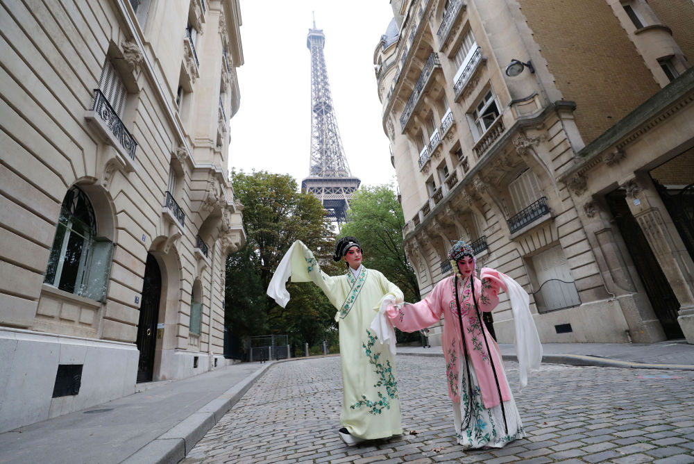 2023年9月13日,江蘇省演藝集團(tuán)昆劇院院長(zhǎng)施夏明(左)和江蘇省演藝集團(tuán)昆劇院國(guó)家一級(jí)演員孔愛萍在法國(guó)巴黎埃菲爾鐵塔附近參加昆曲快閃。新華社記者 高靜 攝