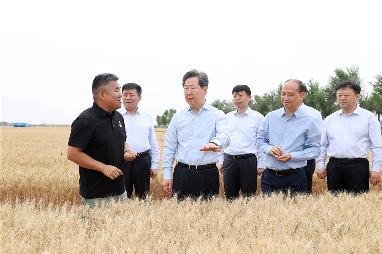 長(zhǎng)葛市石象鎮(zhèn)的高標(biāo)準(zhǔn)農(nóng)田里,金色的麥浪起伏蕩漾,聯(lián)合收割機(jī)穿梭奔忙,一派燦爛豐盈的喜人景象。樓陽(yáng)生走進(jìn)麥田、揉開麥穗,察看麥粒飽滿程度,與農(nóng)戶、農(nóng)機(jī)手親切交流,了解播種面積、麥?zhǔn)者M(jìn)度、收成收入等。他指出,春爭(zhēng)日、夏爭(zhēng)時(shí),要密切關(guān)注天氣變化,搶抓麥?zhǔn)沼欣翱谄?,加?qiáng)跨區(qū)機(jī)收組織調(diào)度,提升機(jī)械化、智能化水平,確保應(yīng)收盡收、顆粒歸倉(cāng)。在河南鼎優(yōu)農(nóng)業(yè)科技有限公司,樓陽(yáng)生走進(jìn)新品種展示中心,了解玉米、瓜果、蔬菜等新品種培育種植情況,鼓勵(lì)企業(yè)不僅要培優(yōu)種好新品種,還要往深加工走,拉長(zhǎng)產(chǎn)業(yè)鏈、提高附加值。在聽取企業(yè)人才引育情況匯報(bào)后,他指出,發(fā)展現(xiàn)代農(nóng)業(yè)離不開一支高素質(zhì)農(nóng)業(yè)從業(yè)者隊(duì)伍,要加強(qiáng)產(chǎn)業(yè)扶持、政策支持,培育引導(dǎo)更多愛農(nóng)業(yè)、有知識(shí)、懂技術(shù)、善經(jīng)營(yíng)的新農(nóng)人,投身農(nóng)村廣闊天地大展身手。