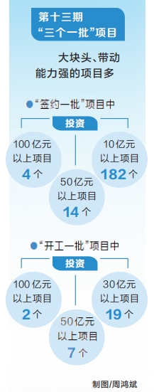 分析第十三期“三個(gè)一批”項(xiàng)目,從投資額度看,大塊頭、帶動(dòng)能力強(qiáng)的項(xiàng)目多。本期活動(dòng)“簽約一批”項(xiàng)目中投資100億元以上項(xiàng)目4個(gè)、50億元以上項(xiàng)目14個(gè)、10億元以上項(xiàng)目182個(gè);“開(kāi)工一批”項(xiàng)目中投資100億元以上項(xiàng)目2個(gè)、50億元以上項(xiàng)目7個(gè)、30億元以上項(xiàng)目19個(gè)。