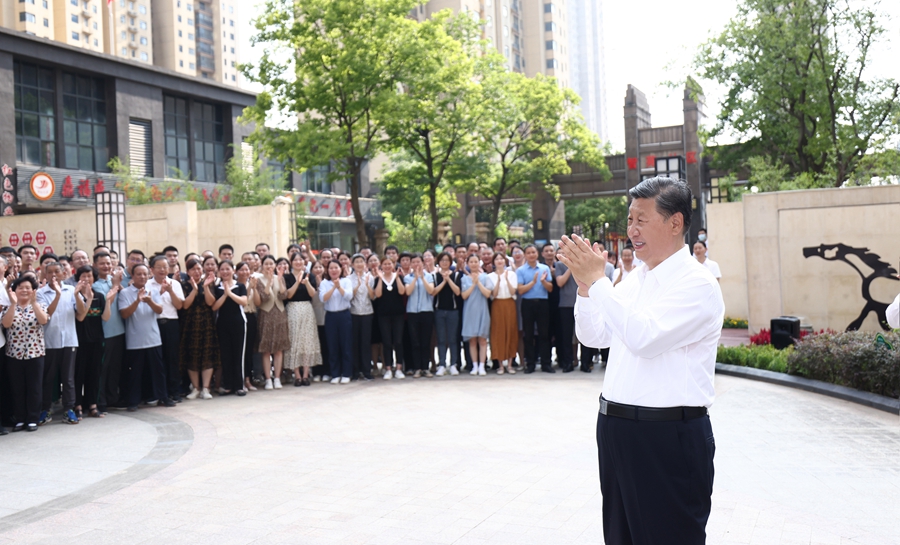 ??2022年6月28日,習(xí)近平總書記在東湖高新區(qū)左嶺街道智苑社區(qū)廣場(chǎng)同干部群眾親切交流。新華社記者 鞠鵬 攝